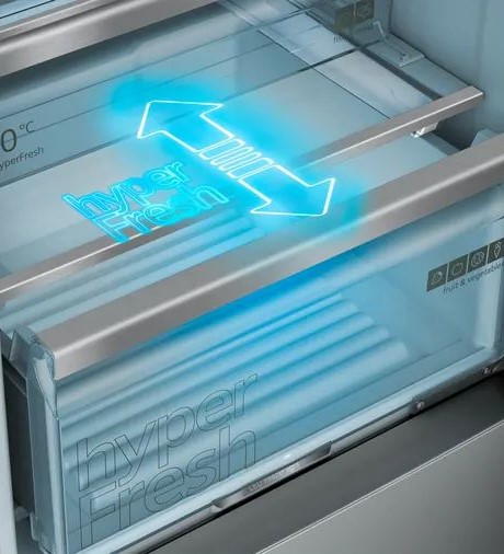 - Ngăn kéo HyperFresh 0°C: nhiều không gian hơn cho trái cây và rau quả, một ngăn kéo gần 0°C cho thịt và cá.